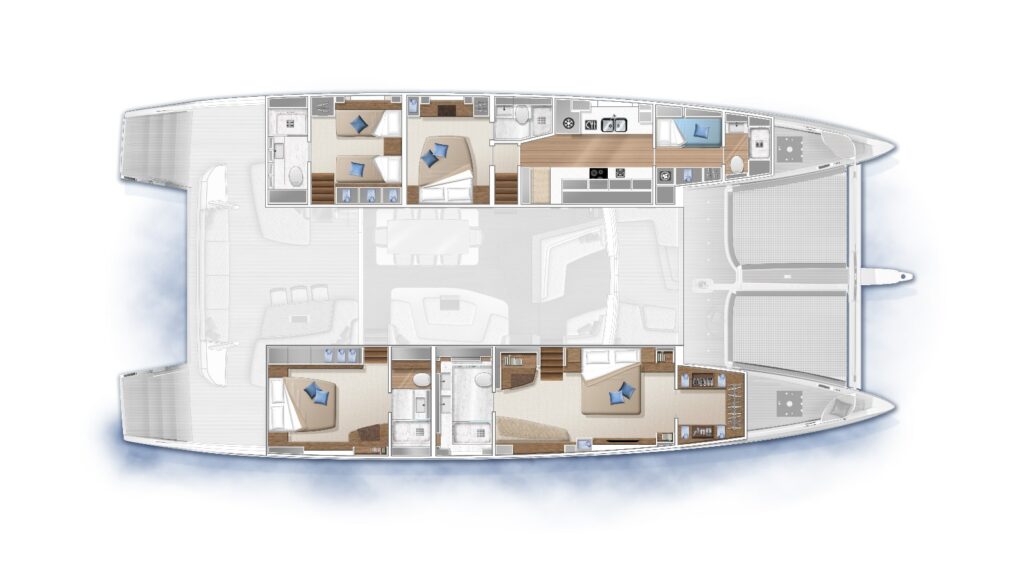 La Désirade has four elegant staterooms: three doubles and a large owner’s suite. It is designed for comfort and privacy. There are several outdoor spaces to relax and enjoy beautiful sea views. The bright main salon is perfect for spending time together.
